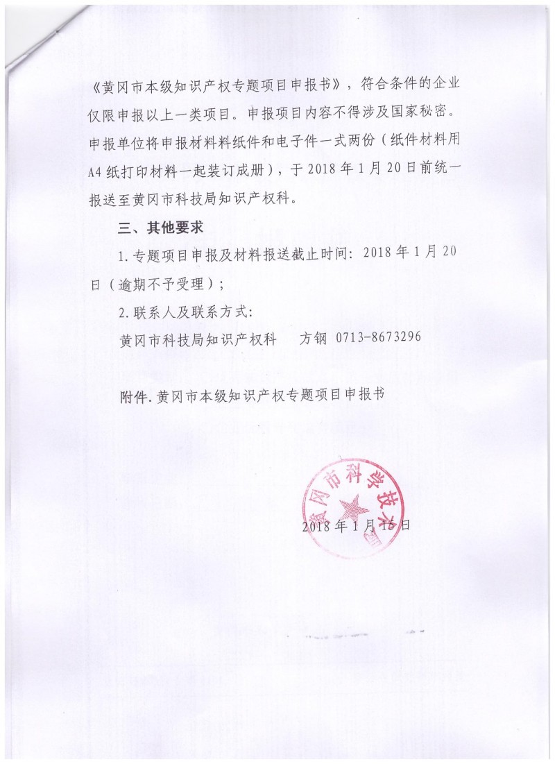 關于組織申報2017年度黃岡市本級知識產權專題項目的通知